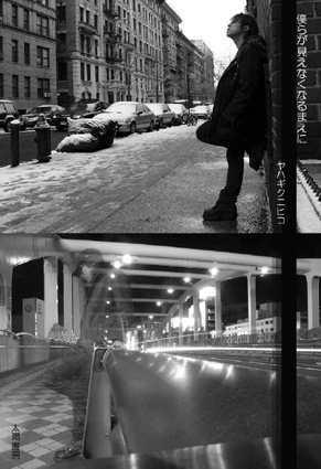 挫折に似た感覚に初めて襲われたのは、2003年の秋でした。平和ボケの新世紀の雑踏に紛れて、大切だった人達と、傷付け合っていました。過ぎ去らぬ後悔を、新しい何かに置き換えていくために旅する毎日。繰り返すことだけが、恐怖で、唯一の安定でした。 2004年に行った中国で、僕は確かに変わり始めました。生きることの意味を、考える前にすべきことを。香港の風水師は僕の心の中の恐怖と安定を見透かしたように、来年、すべてが始まることを告げました。占いを信じるかどうかよりも、嗚呼、始めるんだな、と納得させられたのを覚えています。そして僕は、焦点を越える決意をしました。 2005年の五月に新宿のライブハウスで公演後頭を打ちました。救急車はまるで僕の変わりに叫んでくれているようで、悪い気がしました。深夜、生まれて初めて自分の頭を輪切りにされながら、今まで詰まっていた何かの栓が外れたような気がしました。 不思議なことですが、僕は物心ついた頃から、もうある種の(誰かの)郷愁と共に生きていました。そこでは、記憶も希望も自棄もすべてが最初から色褪せていて、ただ哀しみに似た諦めが、どこか懐かしく傷を晒していました。それに合流するように、現実の、僕の生身の傷が開いたとき、僕は息を吐くように、詩を書くようになっていました。詩は心の傷を埋めるために出てくるのではないか? そんな風に思いながら、焦点へ向かって空間と時間を切り取っては貼り合わせて、真実のようなものに近づこうと、内側にも外側にも必死でした。越えてしまえば、後はもう、開くしかない。限りない拡散。 「僕らが見えなくなるまえに」はこの間の葛藤を、空気を、決意を、どこかに切り出しておきたいという気持ちから紡ぎました。事実、この五二篇の時空を通して、僕は変わることができたし、深く根を下ろすこともできたと思う。殆どが2005年秋〜2006年春に書いたものです。 「焦点までの一息」はそれ以前に少しずつ登り始めていた階段のような感覚と、今の感覚を時系列を外して直線上に配置しなおしていった1995年〜2005年まで10年間のオムニバスです。 この言葉達の幾つかが、誰かの心の郷愁と、傷に似た虚ろを埋めることができれば、幸いです。 (「B.G.M.」より) |