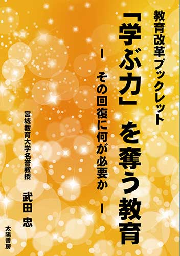 著者は武田忠(宮城教育大学名誉教授)氏。 「今まで、はっきりいって、なにも考えていなかった私が、初めて深く考え、問わなければならないことを知った。」 「宮教大に入ってからいくつかの教育学の授業を受けたが、日本の教育が抱えている問題を自分の問題として捉えたのはこの授業が初めてだった。」 「この授業に出る度に、いままで何の疑問も持たずに当たり前だと思っていたことが、次々と単なる虚像を捉えていたに過ぎないことが暴かれてくる。なんだかこの頃は、この授業を聞くのが不快、というよりも恐ろしいと思うようになった。」 ・・・このような学生たちの言葉が如実に示すように、著者は眠っている学生一人ひとりの思考力を目覚まし、彼らがいつか「自ら考える真の教師」となるべく日々教壇に立っている。文字通り、教育者を育成する「教育のプロ」である。 本書は、そうした真の教育者を育成すべく尽力している著者による、30年に及ぶ研究成果を凝縮させたエッセンスとも言うべき『ブックレット』(小冊子)である。 何が子どもたちの「学ぶ力」を奪うのか? 原因は何なのか? どうしたらそこから回復することができるのか? 真の『理解』とは何か? 何が必要なのか? その先にあるのは、子供たちだけでなく、教師自らもが成長して いく、いわば創造性と理解力をもたらす【進化する教育】である。 最前線となる学校教育の現場のみならず、家庭での学習にも深い示唆を与える一冊。 |