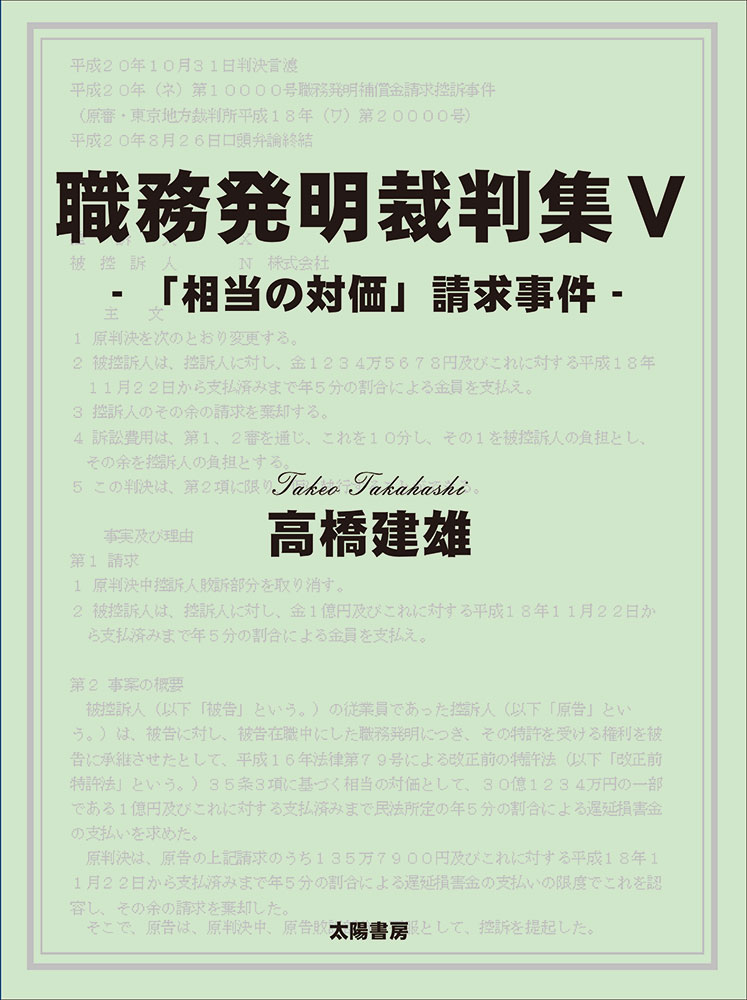 1章 「職務発明」制度:特許法第35条 1 昭和34年特許法(平成16年改正前の特許法) 2 平成16年改正特許法 2 平成27年改正特許法 2章 職務発明裁判集(「相当の対価」請求事件 ) * は本書に収録 a@1 森山製作所・連続捏和機職務発明確認請求事件 a@2 東扇・東急式コンクリートパイル職務発明等補償金未払分請求事件 a@3 日本金属加工・ステンレス金張製造法(クラッド板)等報酬金請求事件 a@4 ミノルタ・カメラ自動焦点調節装置事件 a@5 日本発馬機・職務考案事件 a@6 ミノルタ・カメラ自動焦点調節装置第2事件 a@7 カネシン・建物用金具補償金請求事件 a@8 ゴーセン・「釣り糸」等職務発明・考案の譲渡対価支払請求事件 a@9 象印マホービン・特許出願権譲渡対価請求事件 bP0 オリオン・意匠補償金請求事件 bP1 大井建興・職務発明対価請求事件 bP2 オリンパス光学・ピックアップ装置職務発明補償金請求事件 bP3 セガ・譲渡代金請求事件 bP4 コスモ石油・実績報償金請求事件 bP5 日本システムデザイン・特許を受ける権利の確認請求事件 bP6 三徳・希土類金属の回収方法売買代金等請求事件 bP7 ファイザー・特許権譲渡対価請求事件(第1事件) bP8 ニッカ電測・報酬金請求事件 bP9 日立・光ディスク発明補償金請求事件 bQ0 育良精機・剪断機等職務発明対価支払契約代金等請求事件 bQ1 日立金属・「窒素磁石」発明の対価請求事件 bQ2 アトー・職務発明損害賠償請求事件 bQ3 大昭和精機・スパナ特許権侵害差止等請求事件 bQ4 中央建鉄・実用新案権報酬金請求事件 bQ5 大塚製薬・メプチン職務発明の対価請求事件(第1事件) bQ6 日亜・「青色LED」特許権持分移転手続・相当対価等請求事件 bQ7 育良精機発明等譲渡対価請求事件 bQ8 味の素・アスパルテーム職務発明特許権持分移転登録手続等請求事件 bQ9 東燃・損害賠償等請求控訴事件 bR0 日中医学研究所・研究開発人件費等請求/貸金等請求事件 bR1 旭化成・譲渡対価請求事件 bR2 東芝・電気温水器用ステンレス鋼製缶体報償金請求事件 bR3 住友化学・職務発明の対価請求事件 bR4 藤井合金・職務発明の対価等請求事件 bR5 ファイザー・特許権譲渡代金請求事件(第2事件) bR6 三省製薬・職務発明の対価請求事件 bR7 三井住友建設・相当対価請求事件 bR8 大塚製薬・補償金請求事件(第2事件) bR9 コニカ・フィルム特許出願権譲渡対価請求事件 bS0 和光純薬・職務発明対価請求事件 bS1 積水化学・職務発明の対価請求事件 bS2 豊田中研・燃料噴射弁職務発明対価請求事件 bS3 キャノンマシナリー・職務発明対価金請求事件 bS4 NTT-AT・職務発明対価請求事件 bS5 セルコム事件 bS6 三菱電機・フラッシュメモリ職務発明等相当対価等請求事件 bS7 東芝・フラッシュメモリ相当対価請求事件 bS8 大塚製薬・職務発明対価請求事件(第3事件) bS9 JSR・職務発明対価請求事件 bT0 三菱化学・抗血栓薬職務発明対価請求事件 bT1 三共有機・補償金請求事件 bT2 キヤノン・レーザプリンタ職務発明補償金請求事件(第1事件) bT3 日信化学・職務発明譲渡対価請求事件 bT4 東洋紡・職務発明の対価請求事件 bT5 グンゼ・職務発明の対価請求事件 bT6 シャープ・液晶発明対価支払請求事件 bT7 ブラザー・ラベルライター事件[不当利得返還等請求事件] bT8 東芝・光電面発明譲渡対価請求事件 bT9 ホシデン・職務発明の対価金請求事件 bU0 日立製作所・f-V変換器発明損害賠償請求事件 bU1 武田薬品・発明対価請求事件 bU2 岡田組・特許権移転登録手続等請求事件 bU3 アルプス技研・知的財産に関する使用料請求事件 bU4 トーキン・磁気カード記録再生装置補償金請求事件 bU5 三菱化学・アンプラーグ職務発明の対価請求事件 bU6 東京精密・補償金請求事件 bU7 ソニー・職務発明対価請求事件 bU8 日立製作所・光ディスク装置補償金請求事件 bU9 マルコ・職務発明の対価請求事件 bV0 ニチリン・実用新案実施料請求事件 bV1 新日本理化・職務発明の対価請求事件 bV2 和光純薬・ビリルビン職務発明対価請求事件 bV3 バーズ情報科学研・補償金請求事件 bV4 東芝・職務発明に対する対価支払請求事件 bV5 日立製作所・半導体露光職務発明譲渡対価等請求事件 bV6 キヤノン・レーザプリンタ職務発明補償金請求事件(第2事件) bV7 日本製鋼所・ポリマー加工用二軸押出関連職務発明の対価請求事件 bV8 敷島スターチ・イノシトール発明対価請求事件 bV9 ユーモールド・発明譲渡対価請求事件 bW0 デンソー・燃料ポンプ発明対価請求事件 bW1 日本電気・相当対価請求事件 bW2 塩野義製薬・発明相当対価請求事件 bW3 東芝・ワープロ発明報酬金請求事件 bW4 武田薬品・アリナミン発明対価請求事件 bW5 アステラス・ハルナール発明対価請求事件 bW6 D社・褒賞金請求事件 bW7 三洋電機・エアコン特許権承継対価請求事件 bW8 ソニー・光ピックアップ職務発明対価請求事件(第2事件) bW9 沖電気・部分メッキ方法等補償金請求事件 bX0 トヨタ・車体プレス職務発明対価請求事件 bX1 和光純薬・蛋白測定職務発明補償金請求事件 bX2 NECトーキン・ジャイロ職務発明対価請求事件 bX3 住友金属鉱山・国内出願実績補償金請求事件 bX4 